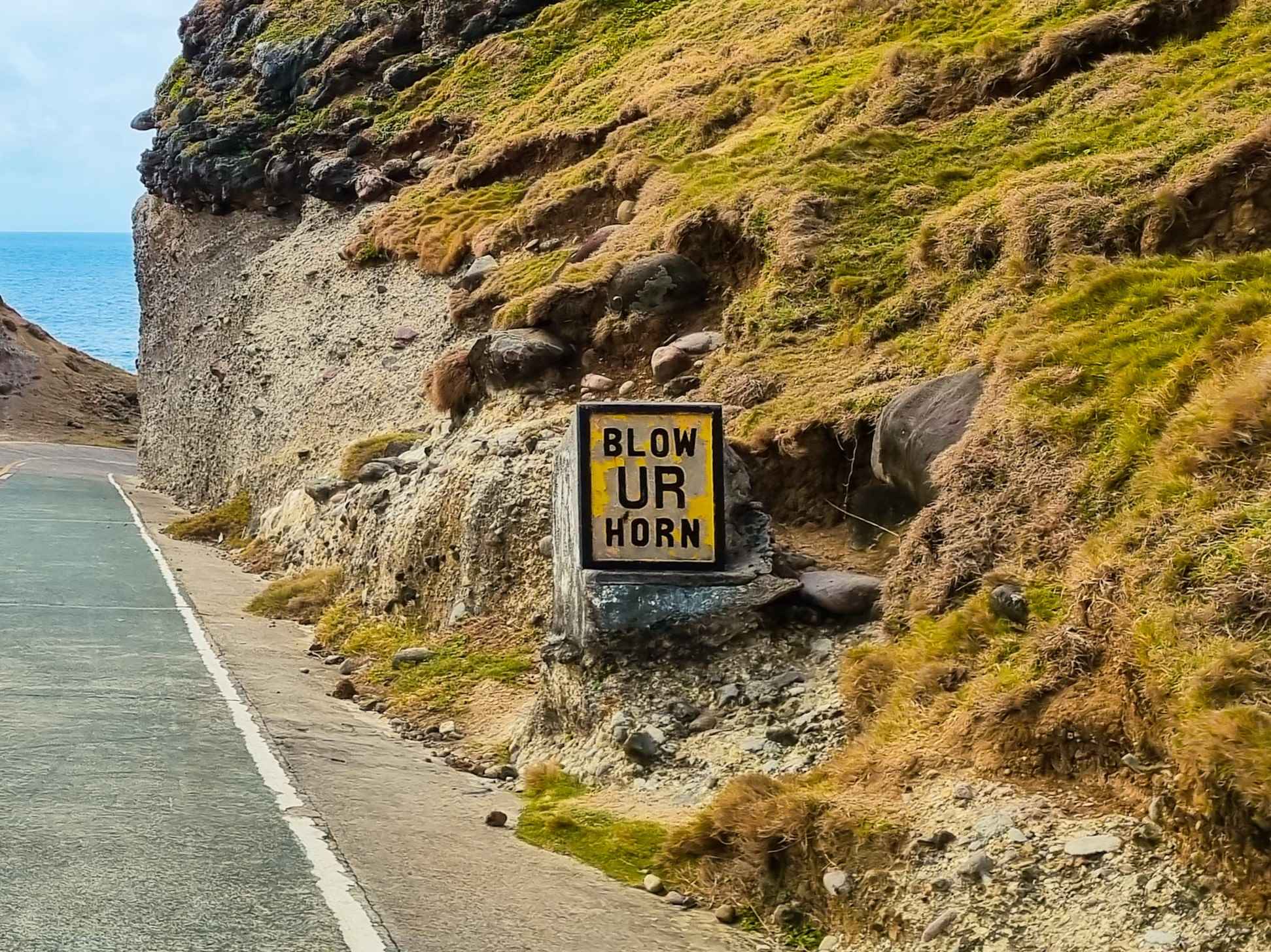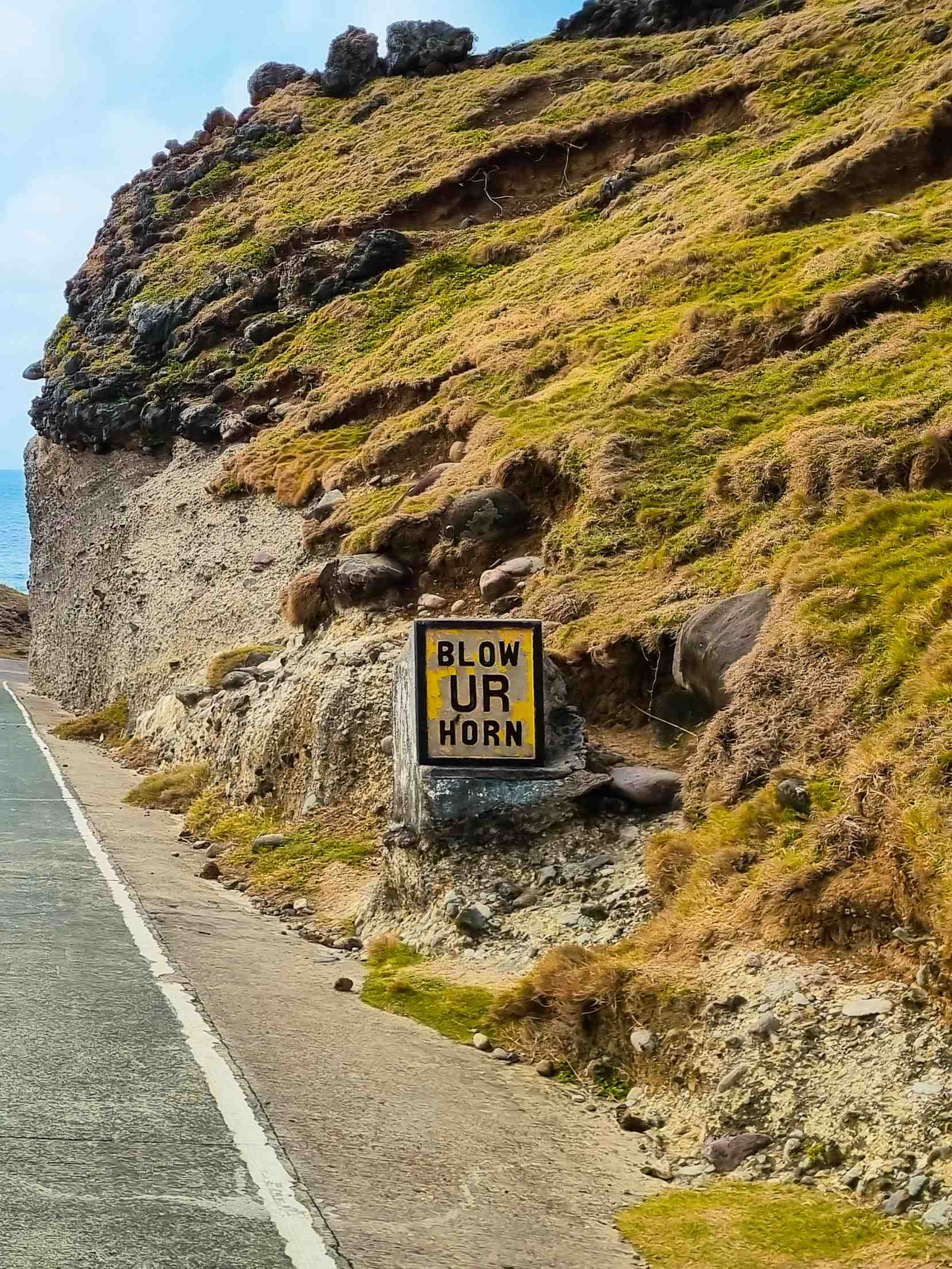 The road from Mahatao to Uyugan, and in Batanes in general, are relatively narrow compared to what one from the metro would have been used to. Apart from that, since roads pass along the hillsides, sharp and blind curves are common. It is for that reason that unlike in the mainland where signs not to blow car horns are pretty usual, the opposite is the one common in Batanes.