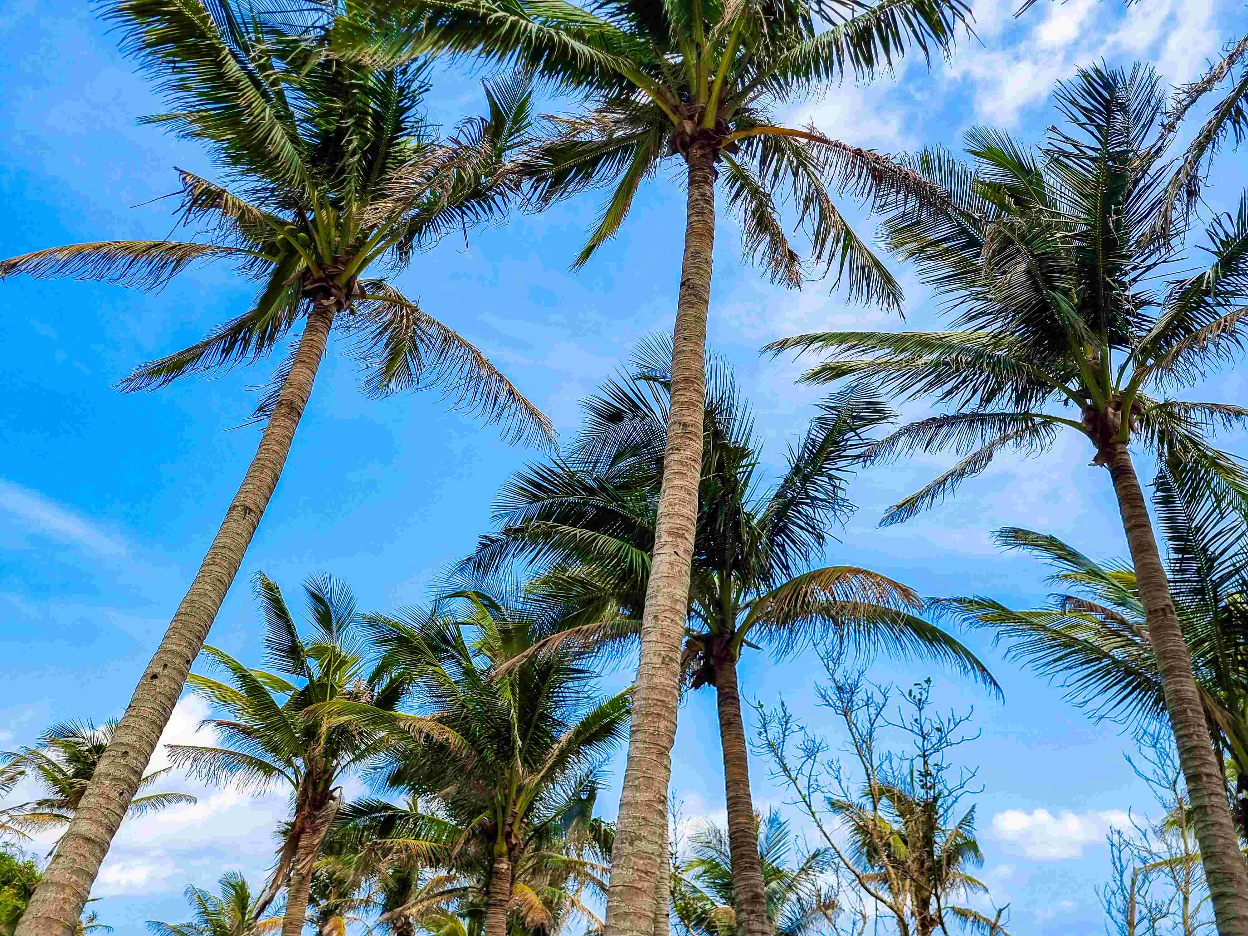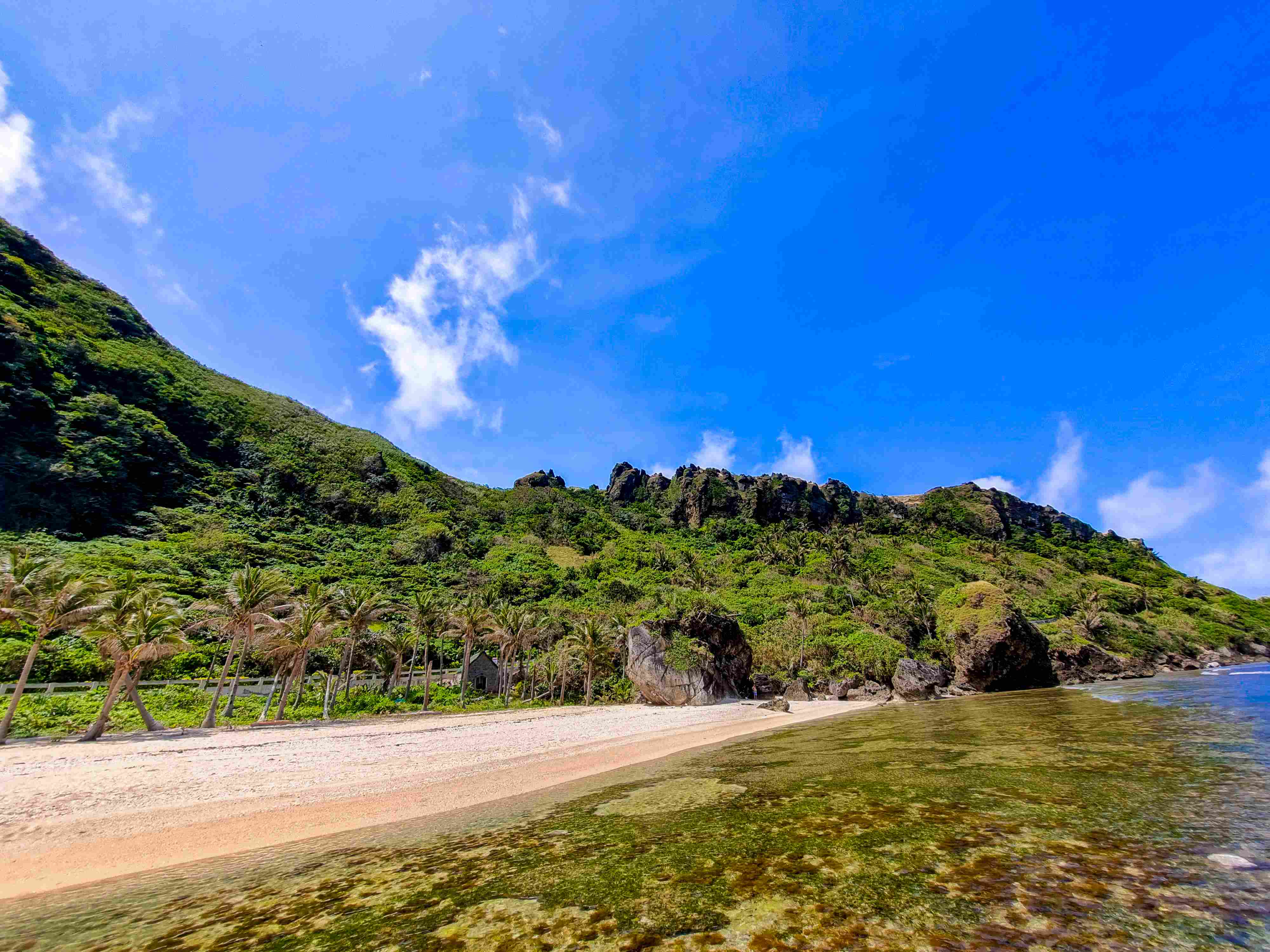 Maydangeb White Beach features a tropical vibe with coconut palm trees, creamy white sand, and scenic hills and cliffs.