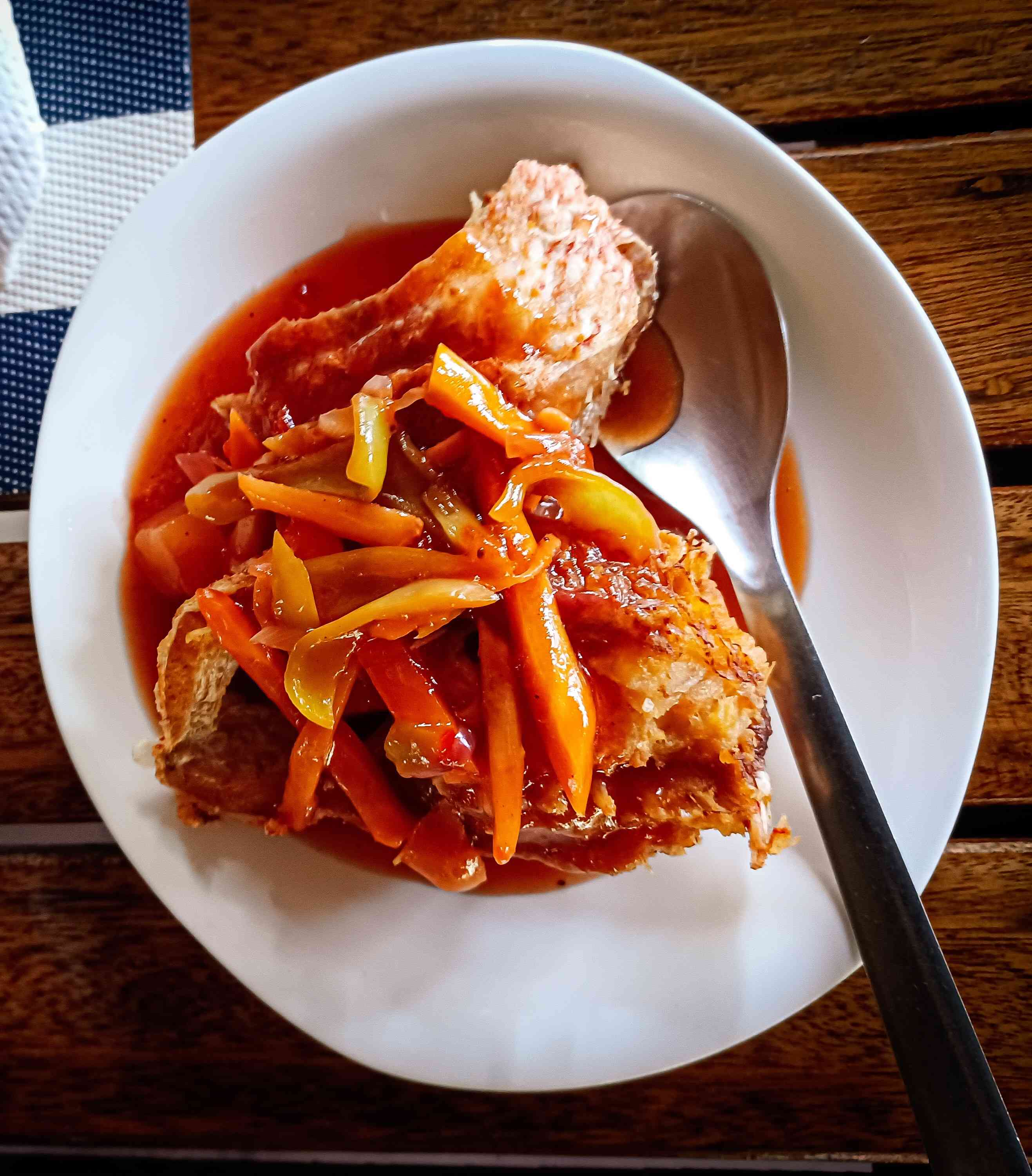 A few minutes more and our lunch was served. For our déjeuner sur l’île, we got dishes of meat and fish, plus a very notable side dish of the elusive pako fern salad! The salad was too good, I was not able to help it but ask Ran where we could buy some as I write this article!