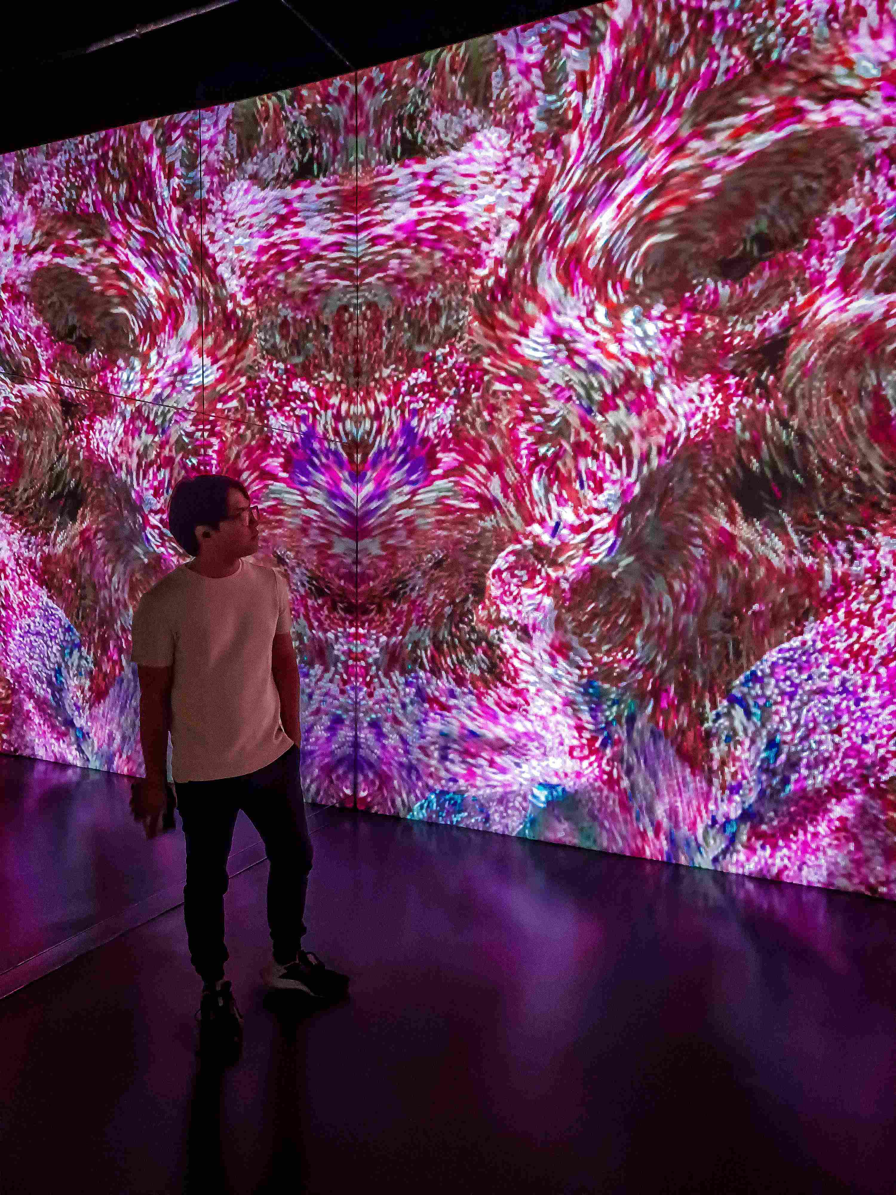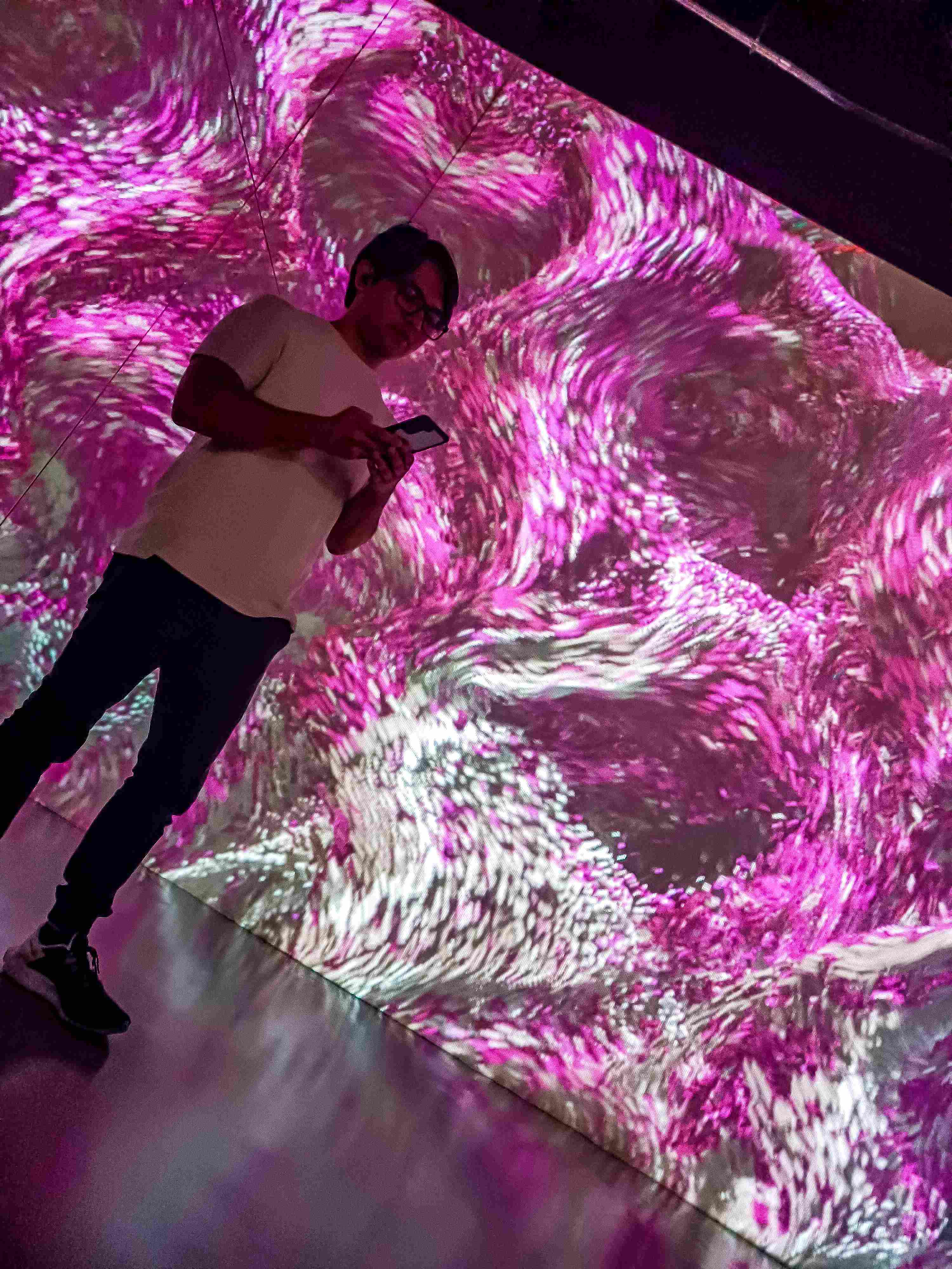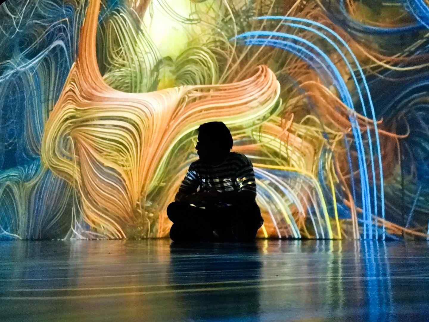 Soon after spending time with the stills, we were led to the first among many of the experiential visual displays which gave a sense of being in a dimension altogether. It was showing lights moving in a pattern, dancing in a mesmerizing choreography in pink to purple hues.