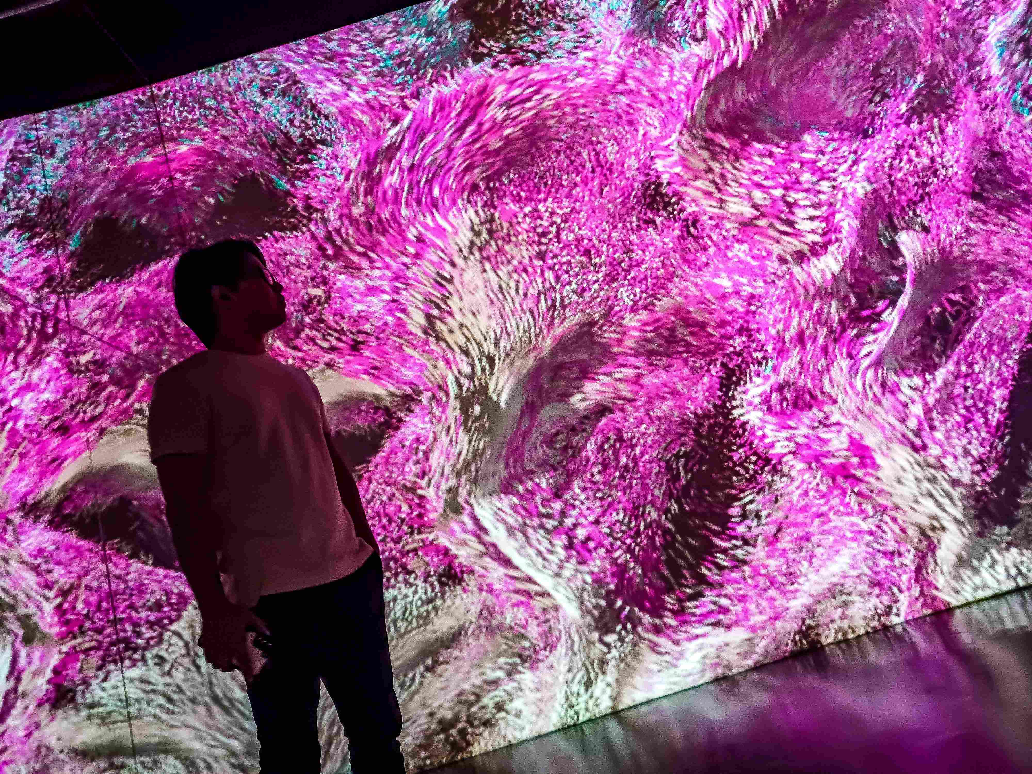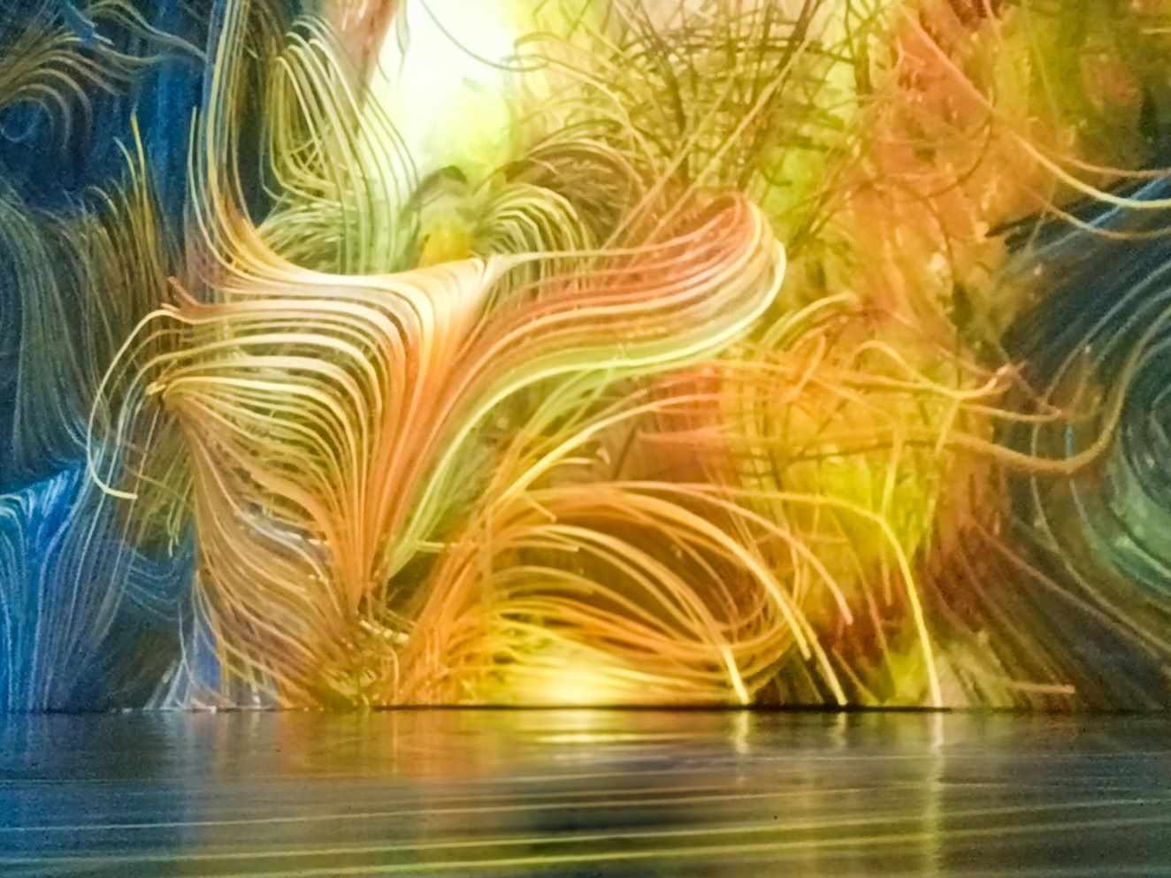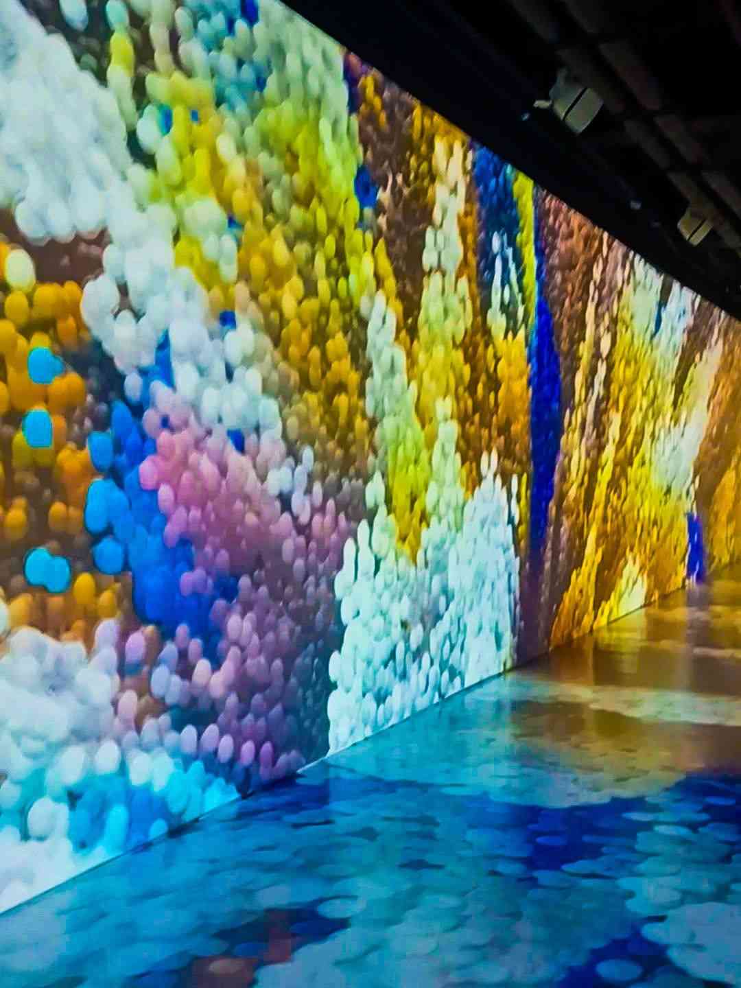 Soon after spending time with the stills, we were led to the first among many of the experiential visual displays which gave a sense of being in a dimension altogether. It was showing lights moving in a pattern, dancing in a mesmerizing choreography in pink to purple hues.