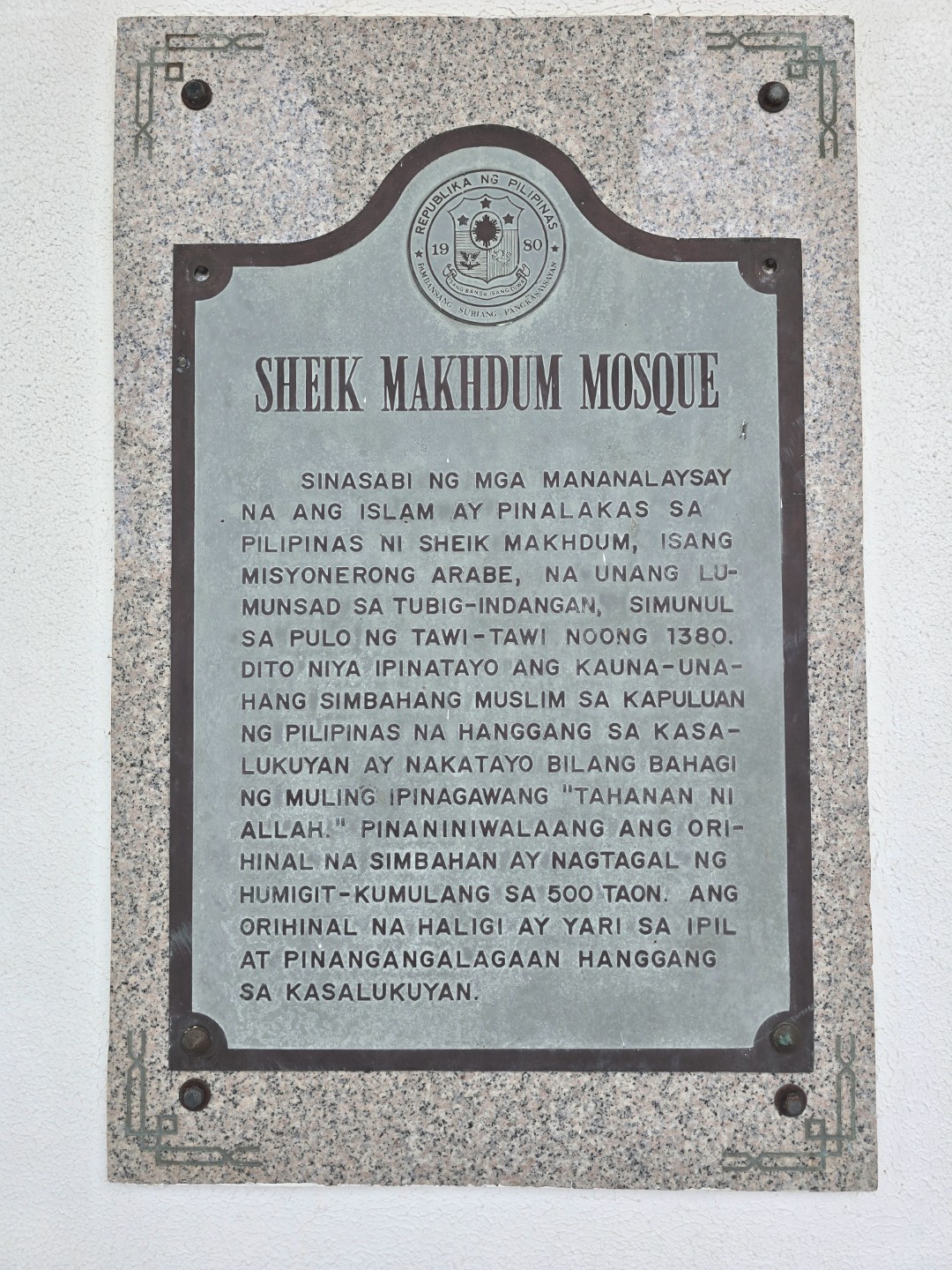 Most information regarding the arrival of Islam is said to be from local folklore, but there is no denying that it happened in the very shores of Tawi–Tawi. The evidence is indisputable. Just barely five minutes away from the port is a mosque that stands on the same ground where the first mosque in the Philippine archipelago was built, the Masjid Sheikh Karimul Makhdum.