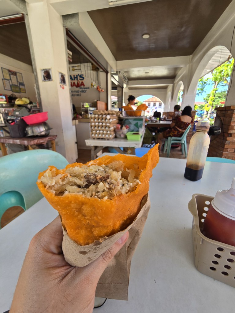 We eventually found our way to an ATM. After withdrawing some cash to get us through the days ahead, we went to the food stalls across the church patio. We were in Ilocos Norte, so what could be a better meal than what Ilocos is known for? Of course, Ilocos empanada with matching miki!