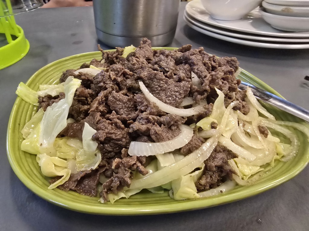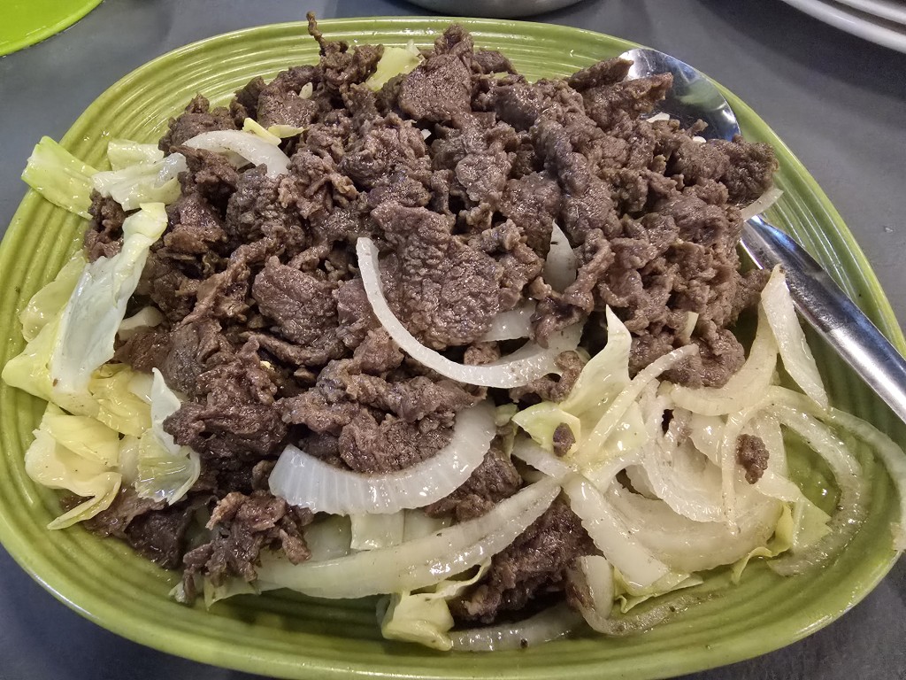 Thinly sliced carabao meat, deep fried until the meat is so tender, it falls apart. Stir fry the same meat with white onions and strips of cabbage. Serve while hot, but dip in soy sauce, calamansi and chili before having a mouthful. Gastronomic explosion.